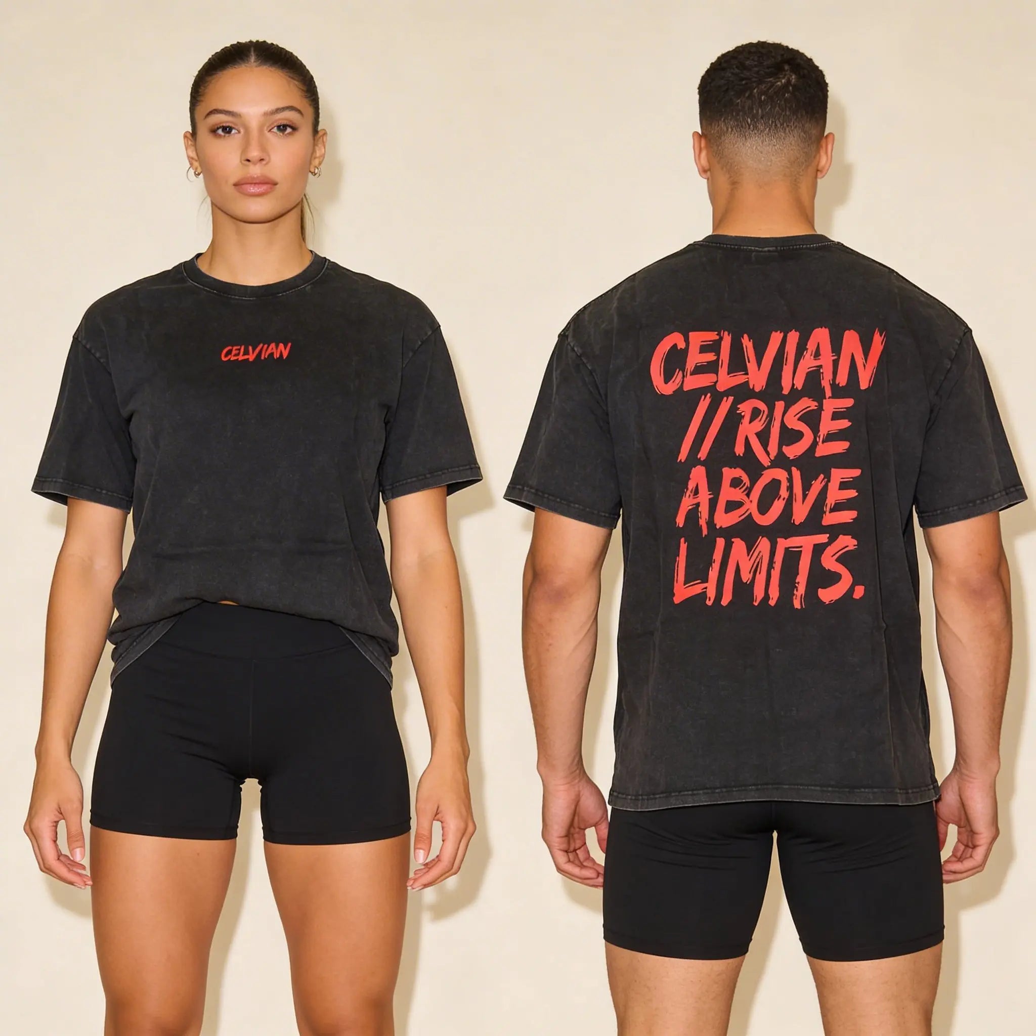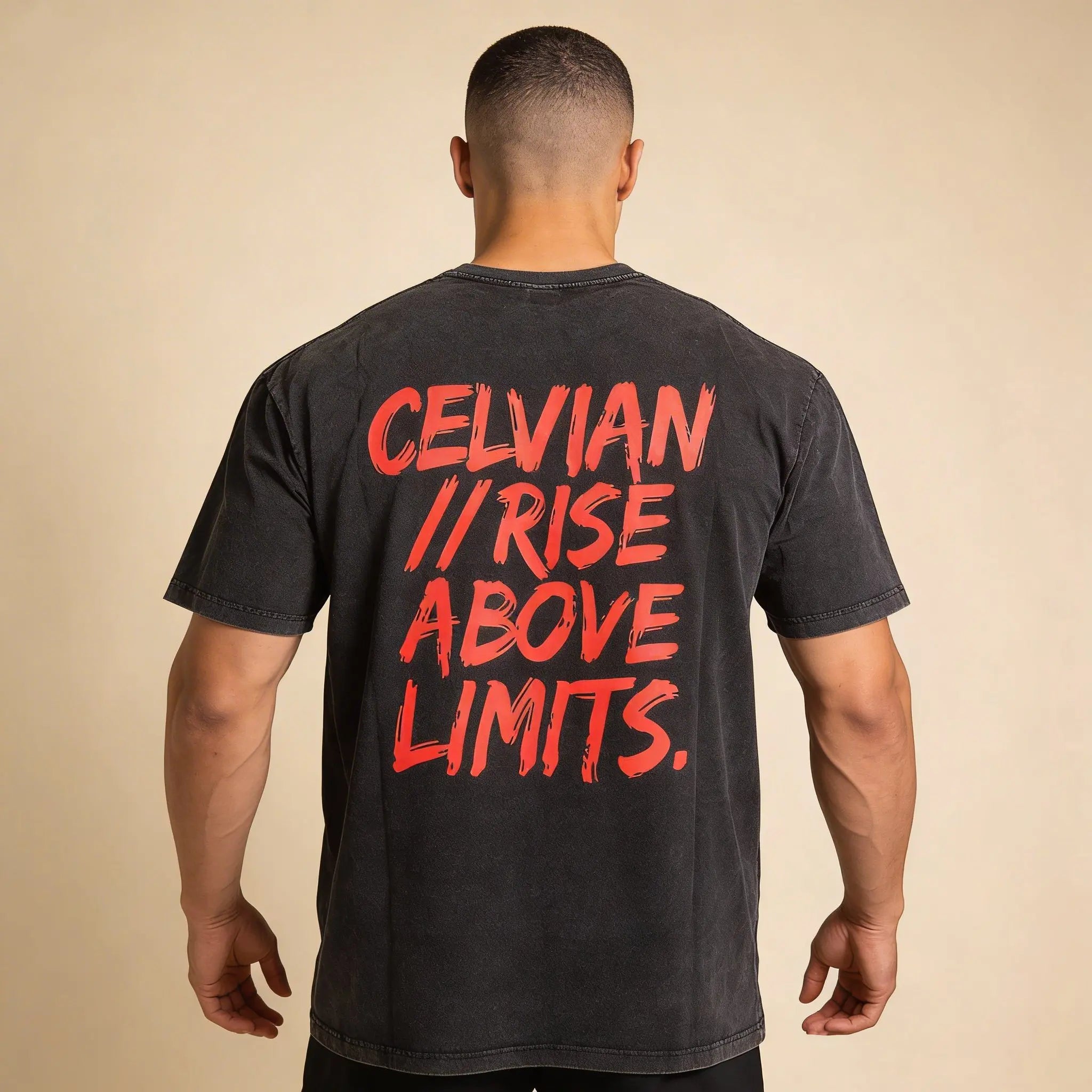 Minimal on the front with a clean CELVIAN chest logo, and bold on the back with the signature RISE ABOVE LIMITS statement graphic. This tee is made to carry the mindset, not just the fit.